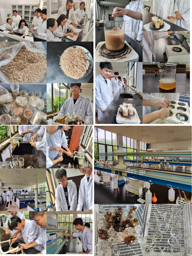 活动前期,材料2301班的同学们利用图书馆、网络等渠道深入开展了文献调研工作,广泛收集国内外关于农林废弃物合成制备表面活性剂的研究资料,对反应原理、技术路线、实验方法等进行全面梳理。指导老师采购了实验药品,准备了相关实验设备及仪器。活动阶段,同学们按照既定方案,开始探索如何利用农林废弃物小麦麸皮合成表面活性剂,通过反复试验,不断优化反应条件,最终从小麦麸皮中提取出了具有优异性能的表面活性剂并用作洗涤剂。接着,同学们利用自己制作的洗涤剂,对无机实验室的试剂瓶、烧杯、锥形瓶等玻璃仪器及实验桌,试剂架,地面等进行了全面清洗。同学们分工协作,有的负责洗刷,有的负责清洗,有的负责擦桌子拖地,现场一片繁忙而有序的景象。经过员工们的辛勤劳动,原本沾满污渍的实验仪器变得焕然一新,整个实验室变得干净整洁。