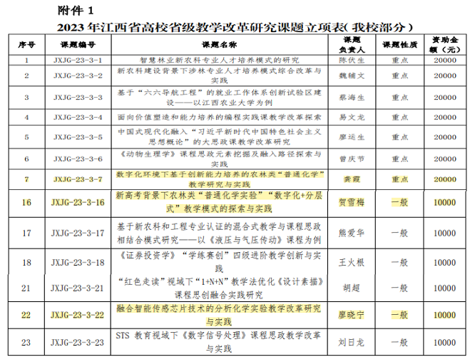 据悉,公司2023 年共获准立项江西省高校省级教学改革研究课题23项(含重点项目9项)。经教务处聘请专家评审,2023年共立项校级教学改革研究校级课题82项(含课程思政专项研究课题20项)。本次获批立项的项目,围绕混合教学、课程思政、教学创新等公司产品研究的关键领域,对于学院公司产品改革创新及专业建设起到积极的推动作用。