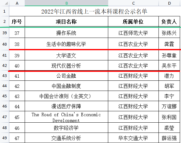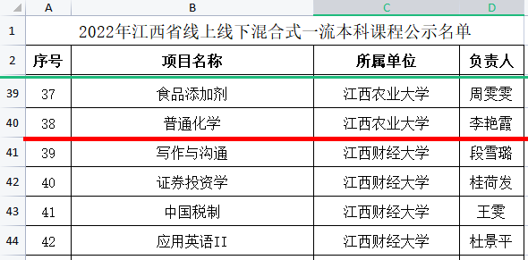 2023年初,根据《关于开展2022年江西省线上、线下、线上线下混合式、社会实践一流本科课程认定工作的通知》(赣教高字〔2022〕33号),经公司申报推荐,省教育厅组织专家评审,公布了2022年度江西省一流本科课程名单,化材院3门课程被认定为江西省一流课程,其中,龚霞老师的通识课“生活中的趣味化学”和吴东平老师的专业课“现代仪器分析”被认定为江西省线上一流本科课程,李艳霞老师的公共基础课“普通化学”被认定为江西省线上线下混合式一流本科课程。
