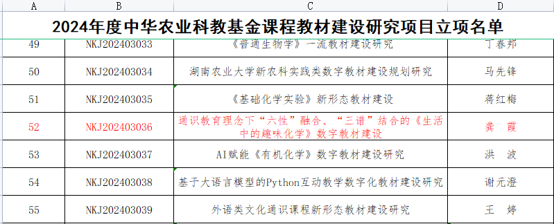 近日,中华农业科教基金会正式公布了2024年度教材建设研究项目立项结果。经专家评审与公示,公司龚霞老师申报的项目“通识教育理念下‘六性’融合、‘三谱’结合的《生活中的趣味化学》数字教材建设”项目成功获得立项。