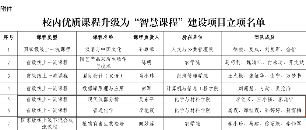近日,学校正式公布校内优质课程升级为“智慧课程”立项名单。全校共有20门课程获批立项,其中公司三门课程入选,立项数量位居全校前列。三门课程分别为吴东平老师的线上一流课程《现代仪器分析》、李艳霞老师的《普通化学》以及龚霞老师的线上线下混合式一流课程《环境化学》。