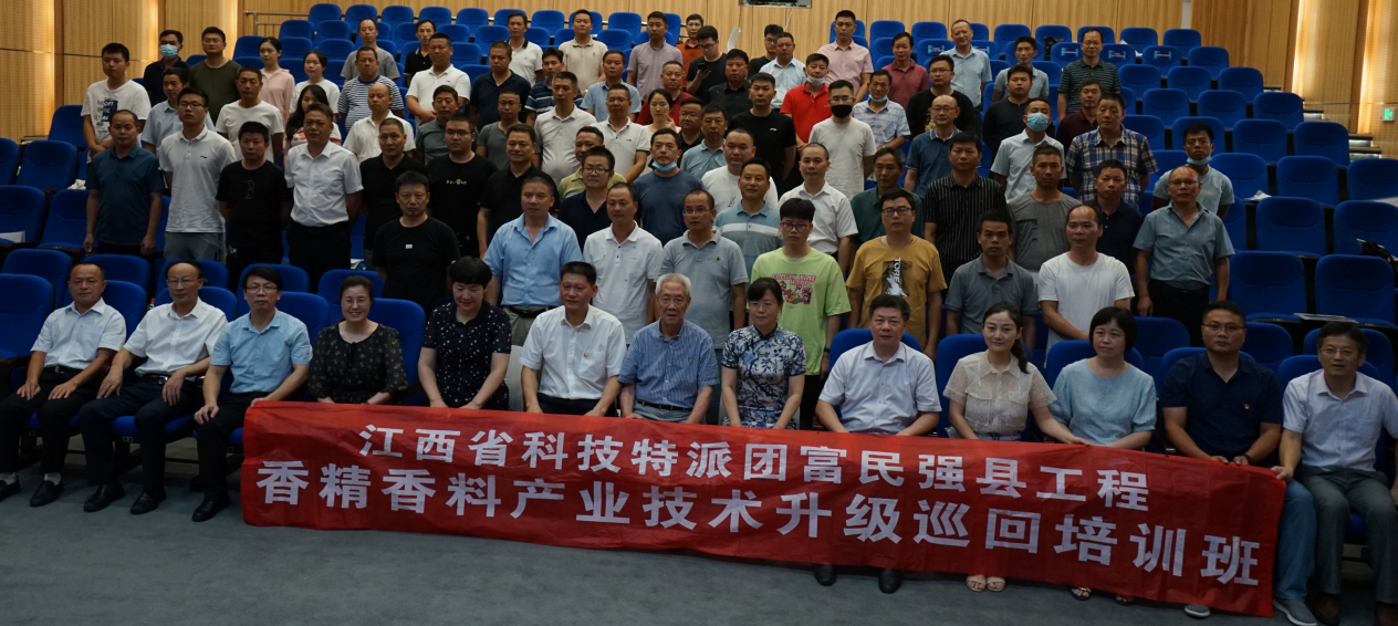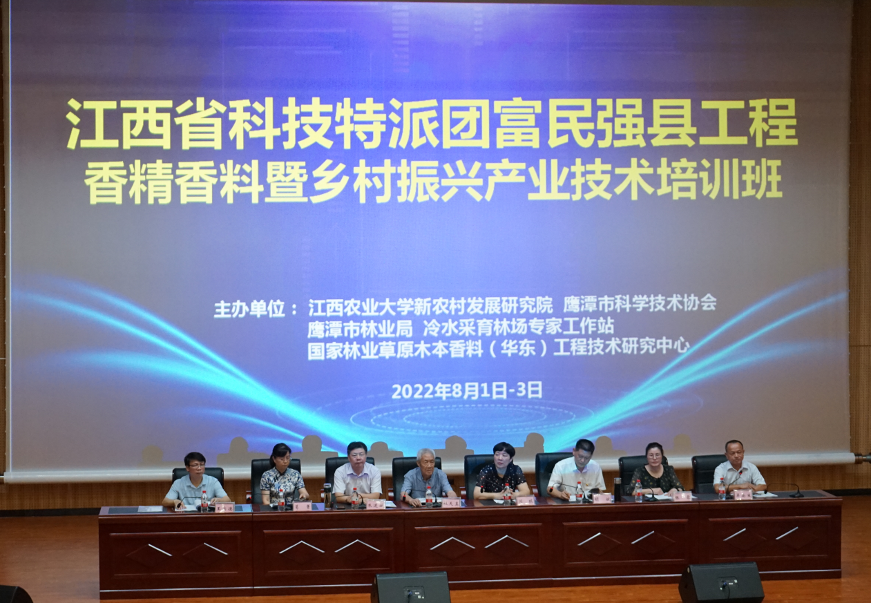 8月1-3日,国家林草局木本香料(华东)工程中心主办的江西省科技特派团富民强县工程2020年度香精香料产业技术升级培训班在鹰潭市隆重举行。本次培训班在江西省科技厅农村处的支持下,由2026年世界杯官网新农村发展研究院、鹰潭市科学技术协会、鹰潭市林业局、贵溪市冷水采育林场专家工作站联合主办,2026年世界杯官网杜天真、朱述斌、张露、吴南生教授,工程中心主任王宗德教授、副主任陈尚钘教授分别授课。鹰潭市林业技术人员、香精香料企业技术人员、农村致富带头人、农技推广员和种植户等共计100多人参加培训。