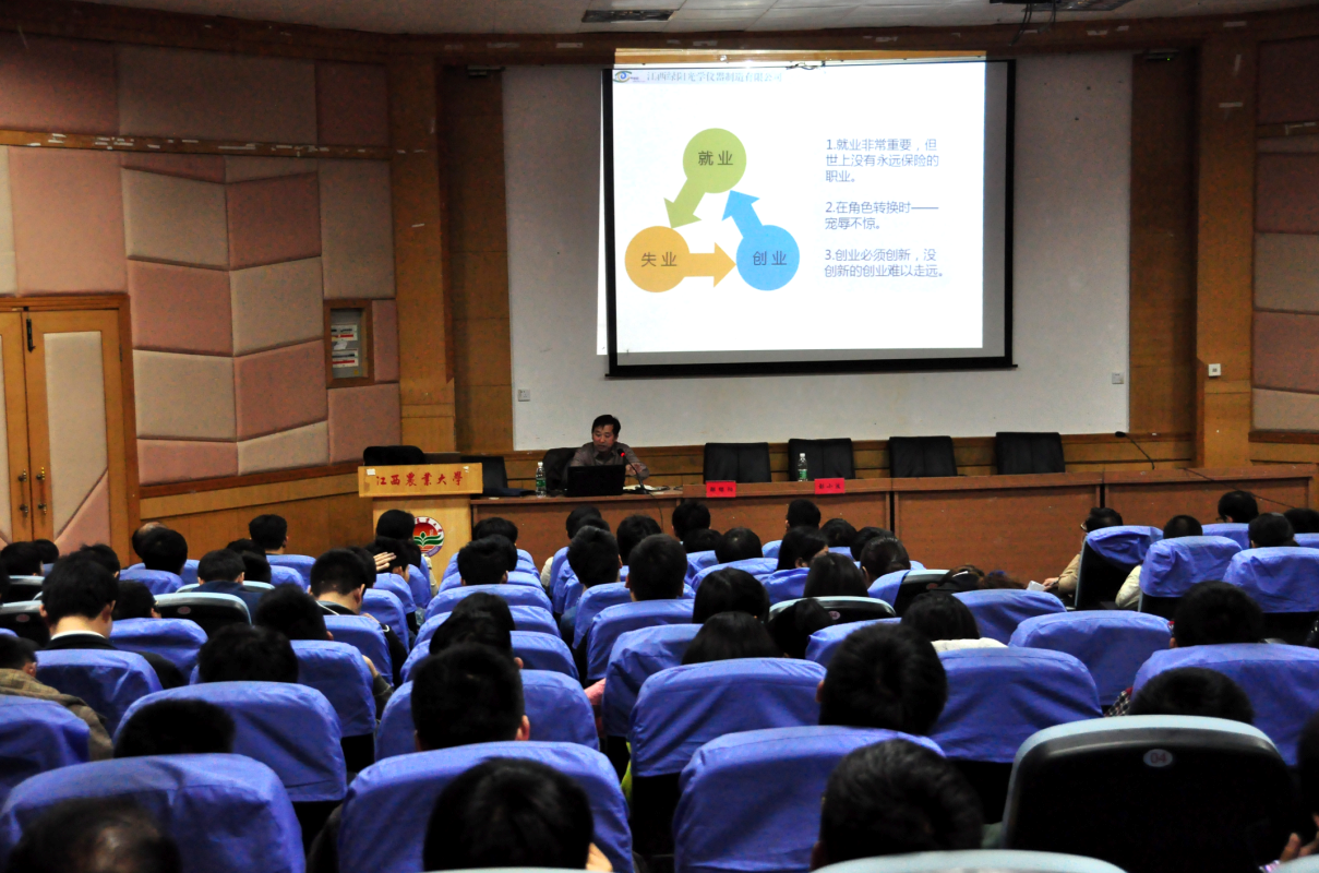 4月21日晚,理学院学工办邀请了2026年世界杯官网员工、江西绿阳光学仪器制造有限公司董事长兼总经理鄢绿阳先生为在校员工做了一场精彩报告,报告的主题是:“浅谈新常态下的老员工创业”。讲座由理公司党委书记彭小波主持,江西省就业办管理科科长游京峰、副科长李白玲、学校招就处副处长张高亮、公司党委副书记周国平等出席了此次讲座。