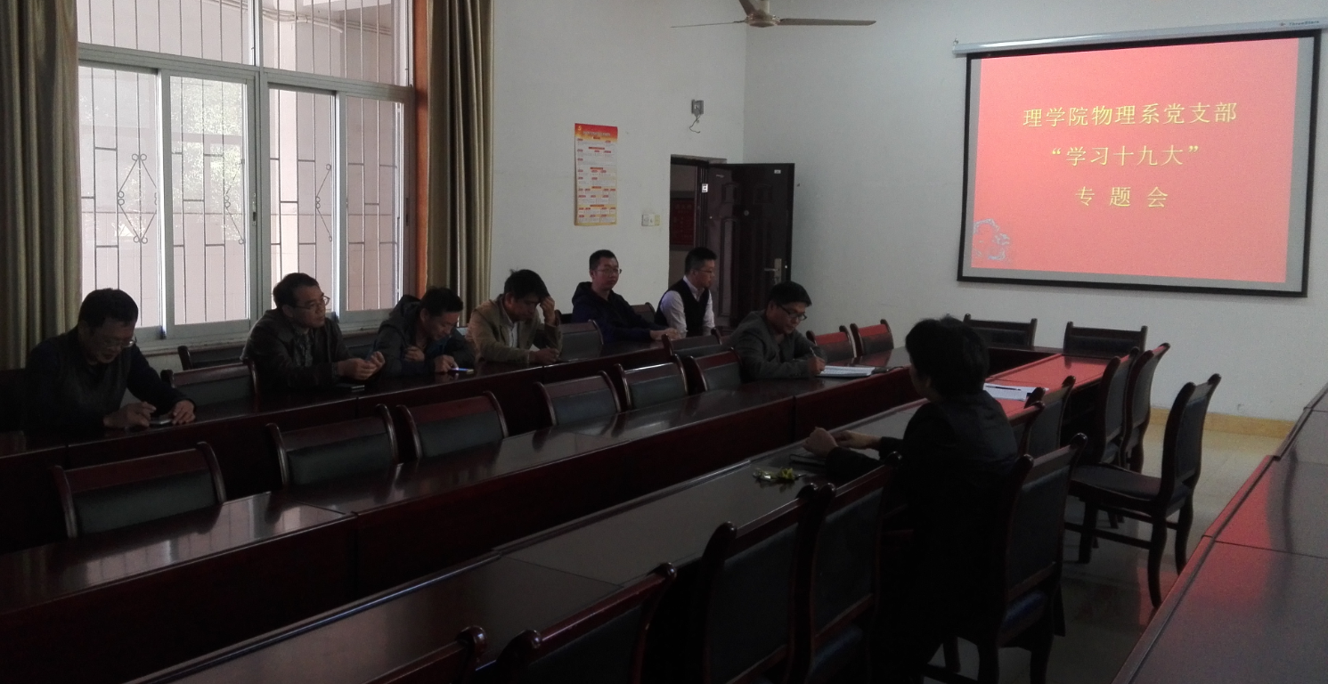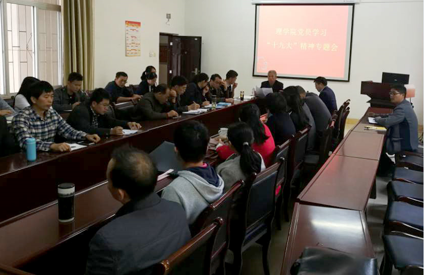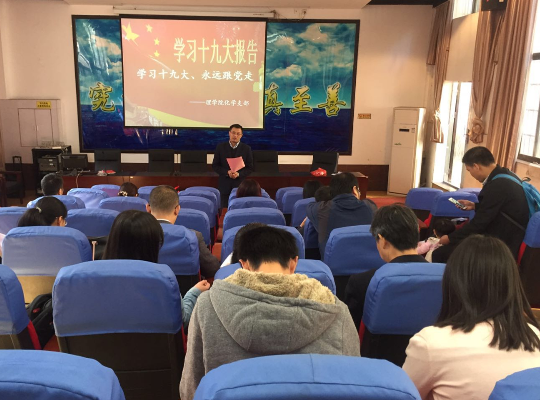 各支部、各团组织以多种形式开展学习活动:数学系党支部组织了学习十九大报告心得交流会;研究生党支部组织全体党员赴八一起义纪念馆和南昌舰参观,组织了十九大报告专题学习会。本科生党支部分小组进行专题学习《党的十九大精神传达提纲》,与会党员交流了学习党的十九大精神心得体会;化学系党支部、物理系党支部、行政党支部分别组织了党的十九大精神专题学习会;学院团委员工会开展了“青春喜迎十九大,不忘初心跟党走”主题征文活动;应化1703班团支部自主开展“喜迎十九大,党团在心中——十九大知多少”专题调研。(廖超 周国平)