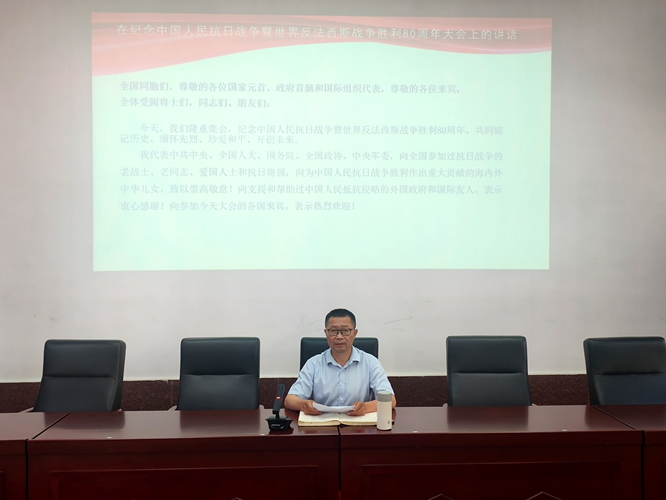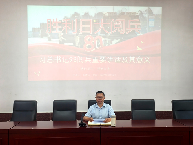 学习会上,公司党委书记刘庆言以《习近平总书记九三阅兵重要讲话精神及其意义》为题,组织全体教职工一起认真学习了习近平总书记在纪念中国人民抗日战争暨世界反法西斯战争胜利80周年大会上的重要讲话精神,从五个方面深刻阐述了九三阅兵的重大意义。