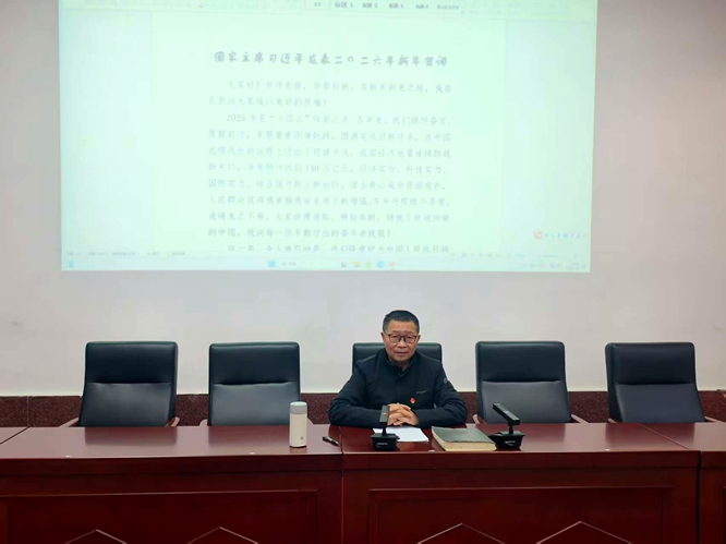 学习会上,公司党委书记刘庆言组织全体教职工一起学习了习近平总书记发表的2026年新年贺词及学校2026年新年贺词,认真回顾总结了国家及学校2025年度取得的各项发展成就。