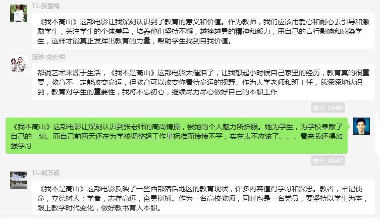 影片结束后,支部党员纷纷结合自己的工作发表了观影感受。大家纷纷表示,电影令人感动不已,被张老师的高尚情操和无私奉献所折服。要学习张董事长的大爱教育情怀,多为被教育者着想,为国家为人民为社会作出自己的积极贡献。