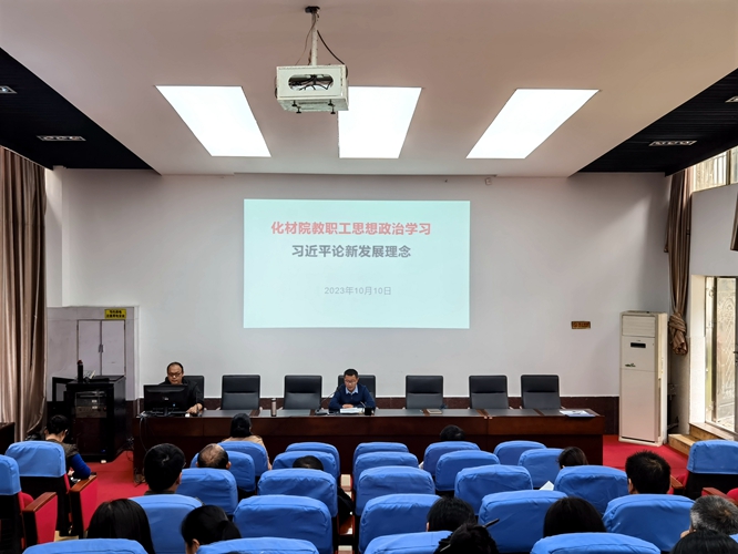 2023年10月10日14:30,学院在致学楼阶梯报告厅召开学院教职工大会,开展了教职工10月份思想政治学习。公司党委书记刘庆言带领全体教职工一同认真学习了《习近平论新发展理念》内容。