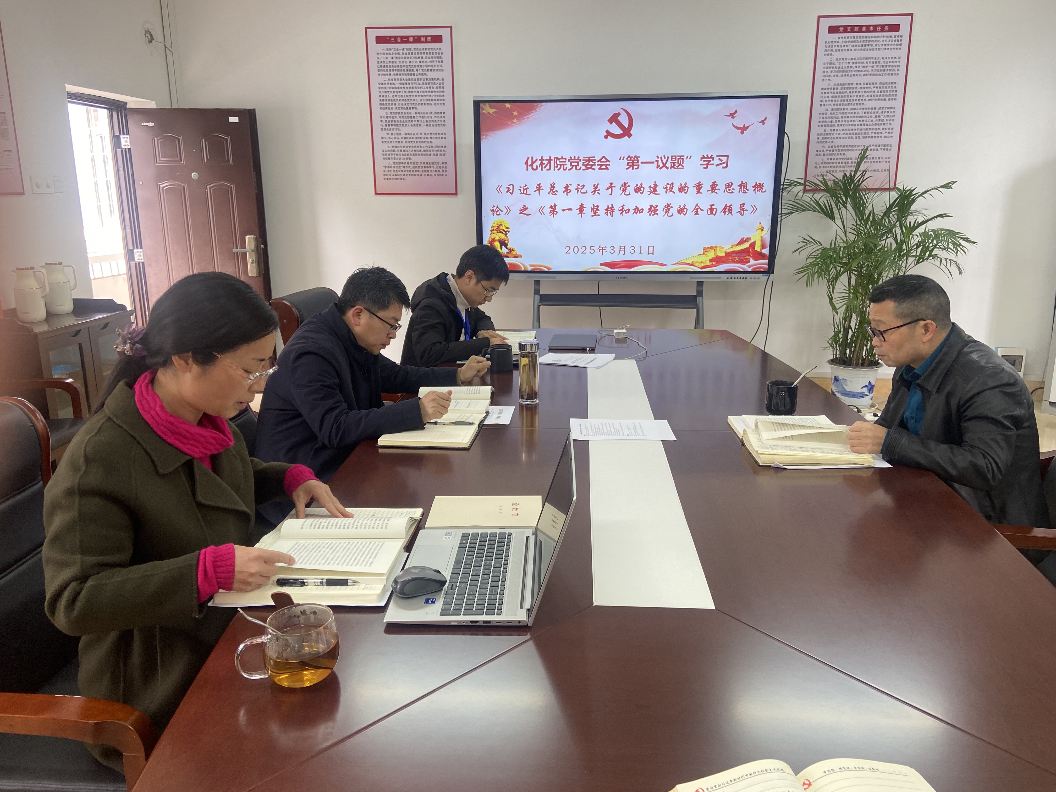 会上,彭玉萌组织大家一起学习了《习近平总书记关于党的建设的重要思想概论》之《第一章:坚持和加强党的全面领导》,班子成员分别结合个人工作实际分享了学习心得体会。