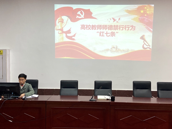 会上,员工党总支书记彭玉萌组织大家学习了《高校教师师德禁行行为红七条》,集中观看了师德师风警示教育典型案例。