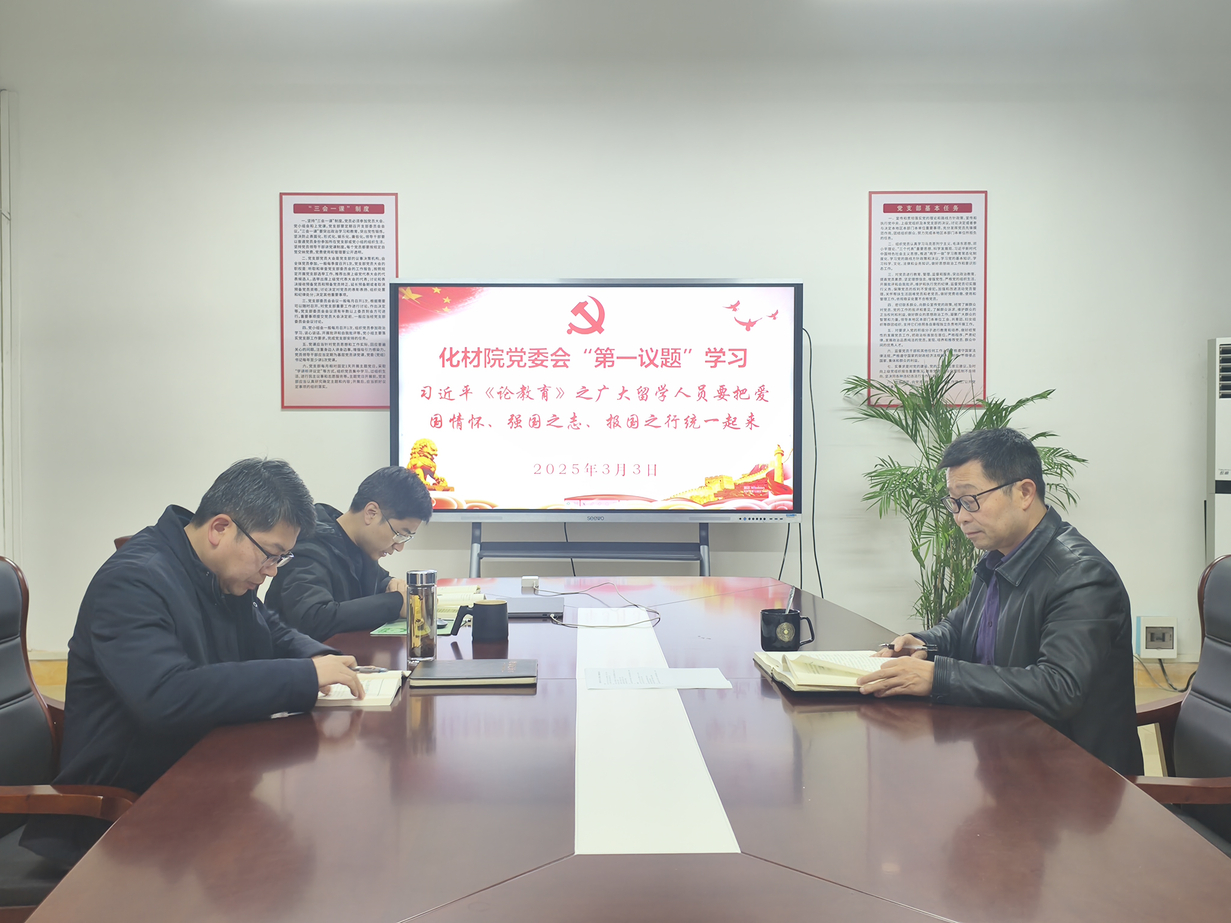 会上,彭玉萌组织大家一起学习了习近平同志《论教育》之“广大留学人员要把爱国之情、强国之志、报国之行统一起来”,班子成员分别结合个人工作实际分享了学习心得体会。