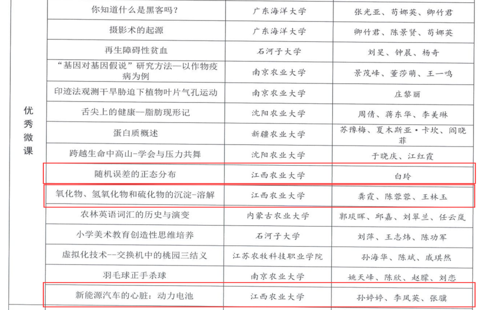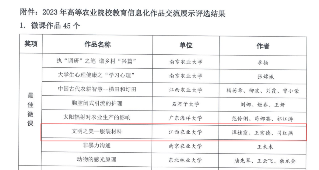 2023年12月6日,中国教育技术协会高等农业院校分会公布了2023年高等农业院校教育信息化作品交流展示评选结果,公司7件作品榜上有名,公司申报4项作品,4项作品全部获奖,获奖数量居全校第一。谭桂霞、王宗德、司红燕报送的《文明之美——服装材料》被评为“最佳微课”;白玲报送的《随机误差的正态分布》,龚霞、陈蓉蓉、王林玉报送的《氧化物、氢氧化物和硫化物的沉淀—溶解》,孙婷婷、李凤英、张骥报送的《新能源汽车的心脏:动力电池》被评为“优秀微课”。