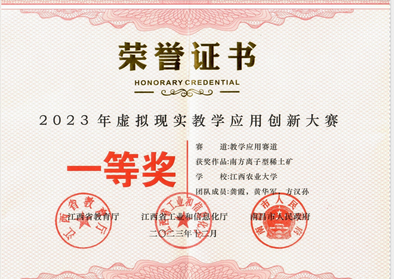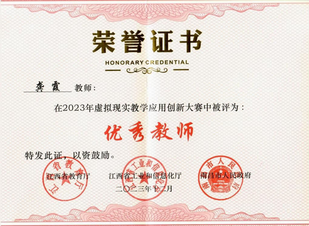 10月19日,由江西省教育厅、江西省工业和信息化厅、南昌市人民政府共同举办的2023年虚拟现实教学应用创新大赛公布比赛结果。我院龚霞教授团队凭借作品《南方离子型稀土矿》在教学应用赛道中荣获等奖,并获优秀教师奖。