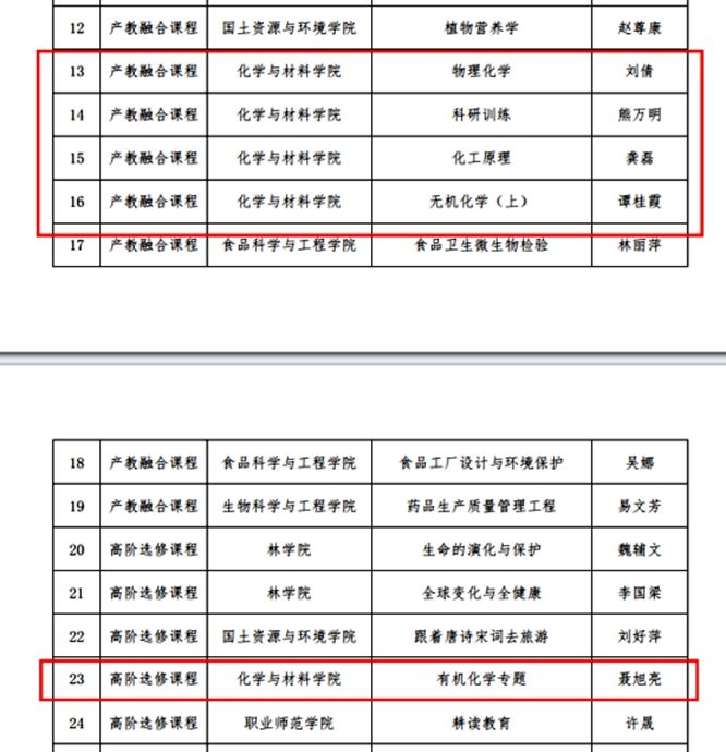 2024年1月4日,学校公布了2023年度33门校级课程立项结果,公司立项5项。刘倩老师的“物理化学”课程、熊万明老师的“科研训练”课程、龚磊老师的“化工原理”课程、谭桂霞老师的“无机化学(上)课程”获批产教融合课程立项。聂旭亮老师的“有机化学专题”课程获批高阶选修课程立项。