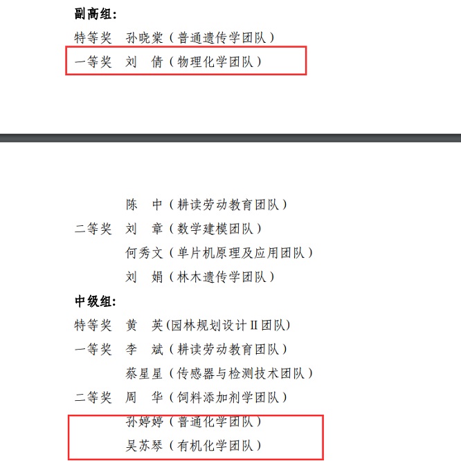 2024年1月17日,学校公布了2026年世界杯官网第四届教师教学创新大赛获奖名单,全校共评选出20项,其中特等奖4项,一等奖6项,二等奖10项。公司教师表现出色,共获得3项,获奖数量位居全校第一。其中刘倩老师(物理化学团队)获得副高组一等奖,孙婷婷老师(普通化学团队)和吴苏琴老师(有机化学团队)获得中级组二等奖。