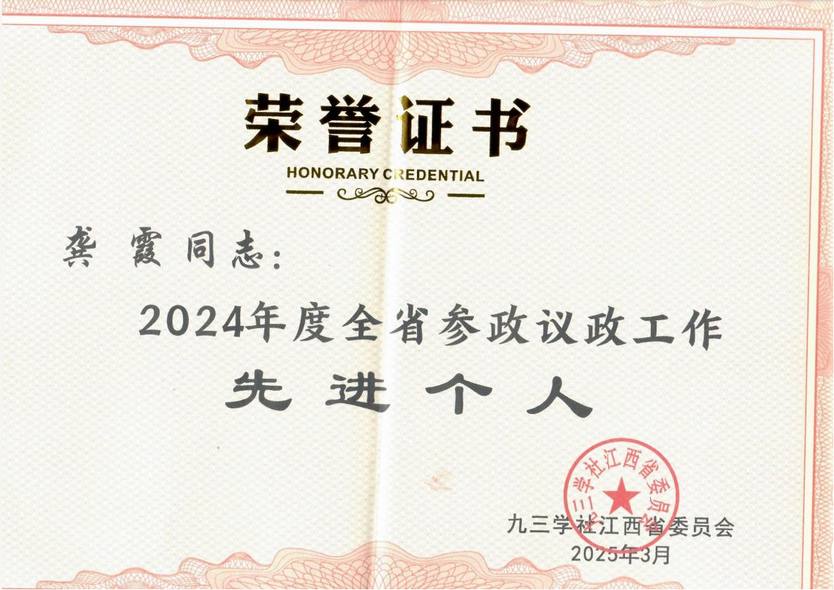 近日,九三学社江西省第九届委员会第四次全体会议在南昌召开。会议表彰了2024年度综合履职评价先进集体、全省十佳支社、优秀专门(工作)委员会、参政议政工作先进个人。公司龚霞教授荣获九三学社江西省委员会“2024年度参政议政工作先进个人”称号。