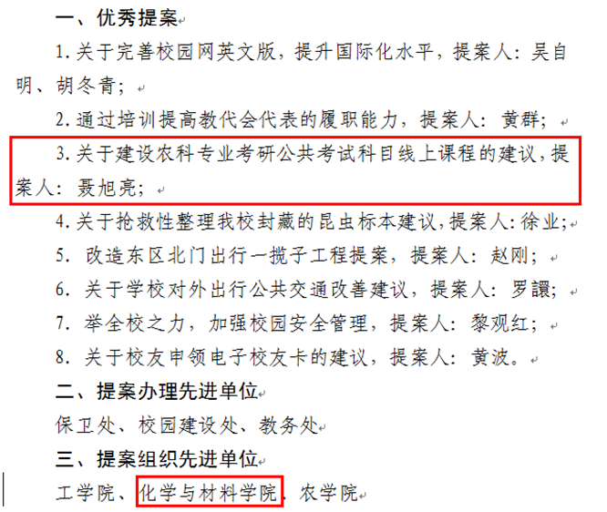 公司党政领导历年来都非常重视“双代会”提案工作,要求每位“双代会”的代表们至少提出一个提案,要求“双代会”的代表们以高度的主人翁意识,充分行使职权,切实履行职责,深入调查研究,广泛征求意见,就学校发展重大问题和涉及师生切身利益的实际问题积极建言献策,助推学校事业健康持续发展。2023年公司“双代会”代表们共提交7份优质提案,聂旭亮代表提出的“关于建设农科专业考研公共考试科目线上课程的提案”的提案获评优秀提案,学院分工会获评提案组织先进单位。
