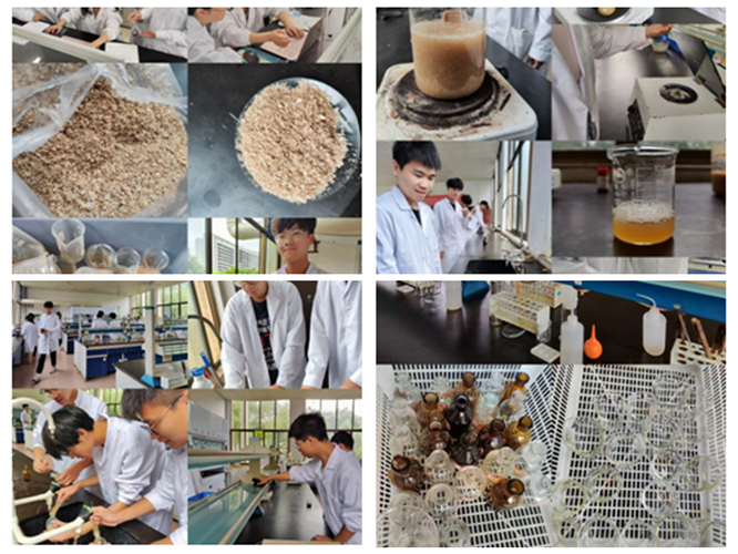 活动前期,材化2301班的同学们利用图书馆、网络等渠道深入开展了文献调研工作,广泛收集国内外关于农林废弃物合成制备表面活性剂的研究资料,对反应原理、技术路线、实验方法等进行全面梳理。指导老师采购了实验药品,准备了相关实验设备及仪器。活动阶段,同学们按照既定方案,开始探索如何利用农林废弃物小麦麸皮合成表面活性剂,通过反复试验,不断优化反应条件,最终从小麦麸皮中提取出了具有优异性能的表面活性剂并用作洗涤剂。接着,同学们利用自己制作的洗涤剂,对无机实验室的试剂瓶、烧杯、锥形瓶等玻璃仪器及实验桌,试剂架,地面等进行了全面清洗。同学们分工协作,有的负责洗刷,有的负责清洗,有的负责擦桌子拖地,现场一片繁忙而有序的景象。经过员工们的辛勤劳动,原本沾满污渍的实验仪器变得焕然一新,整个实验室变得干净整洁。