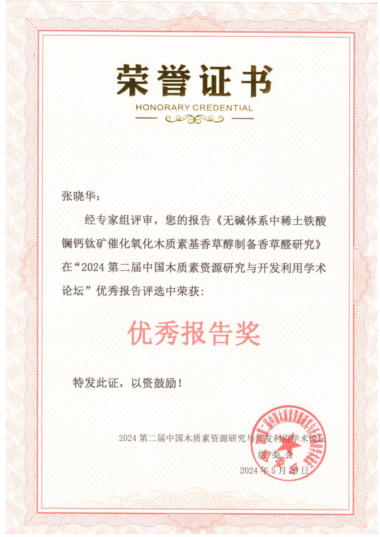 为进一步促进学科交叉融合、产学研用协同创新和推动高素质化工创新人才的培养,2024年5月17—19日,化学系支部委员张晓华副教授参加由中国木质素资源研究与开发利用学术论坛组委会和中科材研(北京)新材料技术中心共同举办的“2024第二届中国木质素资源研究与开发利用学术论坛”。期间,张晓华副教授做了以《无碱体系中稀土铁酸镧钙钛矿催化氧化木质素基香草醇制备香草醛研究》为题的学术报告,并获得了“优秀报告奖”。