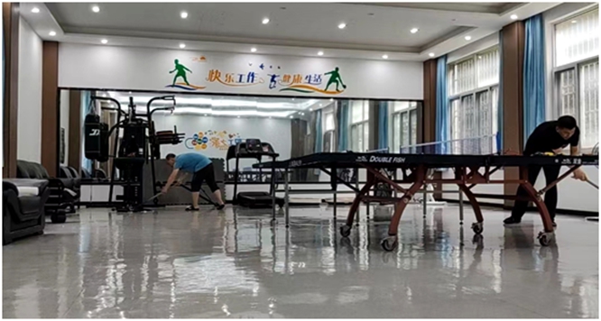 由于近期天气多变,化材院工会之家出现较为严重的返潮现象,导致院工会之家卫生状况欠佳。6月17日,化学系教工支部党员陈金珠和聂旭亮充分发挥党员先锋模范作用,主动开展志愿服务工作,对工会之家的桌椅,健身设备,地面等进行了全面打扫。经过两位老师的辛勤打扫,整个工会之家变得干净整洁。