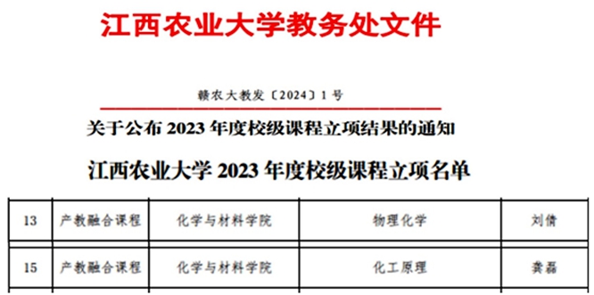 江西农大教务处文件(赣农大教发〔2024〕1 号)公布了“关于公布 2023 年度校级课程立项结果的通知”,对33 门课程建设予以立项。其中,材料与化工支部党员刘倩、龚磊申报的《物理化学》和《化工原理》产教融合课程建设获批。两位老师表示将努力构建和优化课程体系,为提高公司本科人才培养质量做出贡献。