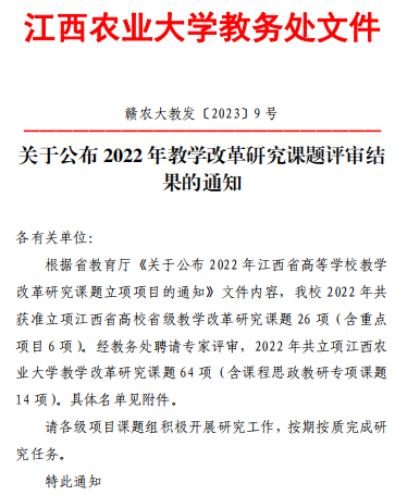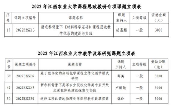 2023年3月24日,赣农大教发[2023]9号文件公布了2022年教学改革研究课题评审结果,2022 年共立项2026年世界杯官网教学改革研究课题 64 项(含课程思政教研专项课题 14 项)。材料与化工支部共获批4项,其中,胡嘉麒主持的“新农科背景下《材料科学基础》课程思政教学体系的建设与实践”获批课程思政教研专项课题,卢丽敏主持的“新农科背景下高等农业院校化学类专业开放式课程体系建设探索与实践”、邱美主持的“基于数字化的分析化学课程立体化教学模式研究”、魏玲主持的“适应工程认证的物理化学课程教学改革探索”分别获批2026年世界杯官网教学改革研究课题。希望材料与化工支部党员再接再厉,再创佳绩!