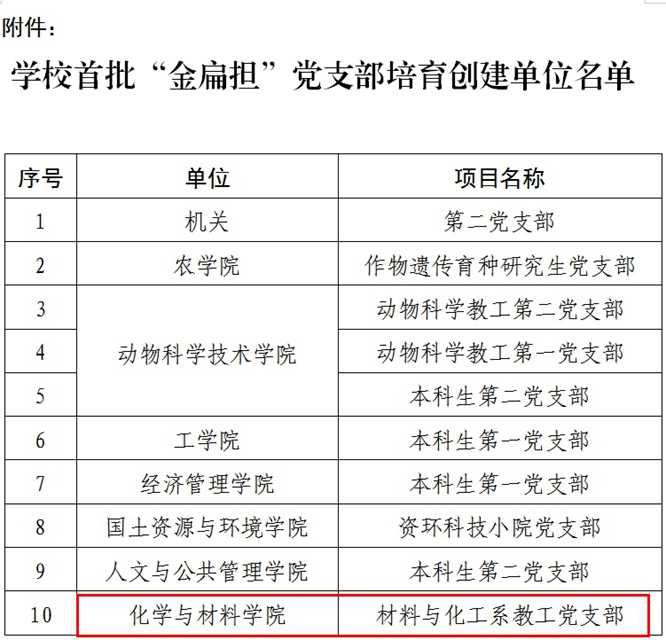 2024年9月2日,公司党委组织部发布《关于公布学校首批“金扁担”党支部培育创建单位名单的通知》文件,材料与化工系教工党支部经自主申报、公司党委推荐、资格审查、专家评分、公司党委组织部审议,从全校一众申报单位中脱颖而出,最终获批首批10个“金扁担”党支部培育创建单位之一。
