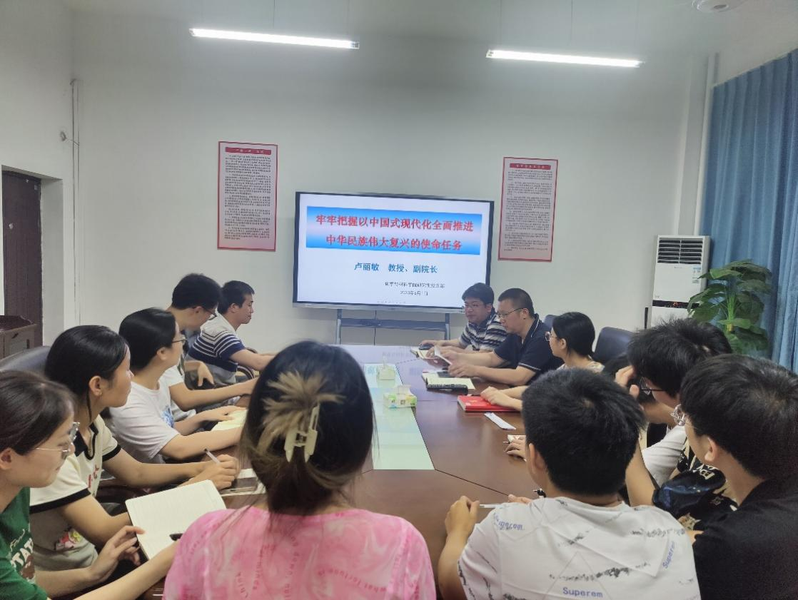 为深入学习贯彻党的二十大精神,推进主题教育走深走实,2023年6月1日19:40,党委委员、学院副经理卢丽敏教授为研究生支部党员讲授题为《牢牢把握以中国式现代化全面推进中华民族伟大复兴的使命任务》的专题党课。