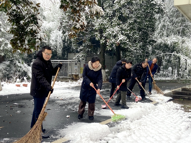 为全力保障师生平稳安全出行,2024年1月22日上午,学院组织党政领导、行政坐班人员及党员志愿者在学院办公楼、实验楼周边开展清扫积雪活动。学院员工党总支书记、本科生第一党支部党员彭玉萌,本科生第一党支部书记王艺霖参与本次活动。