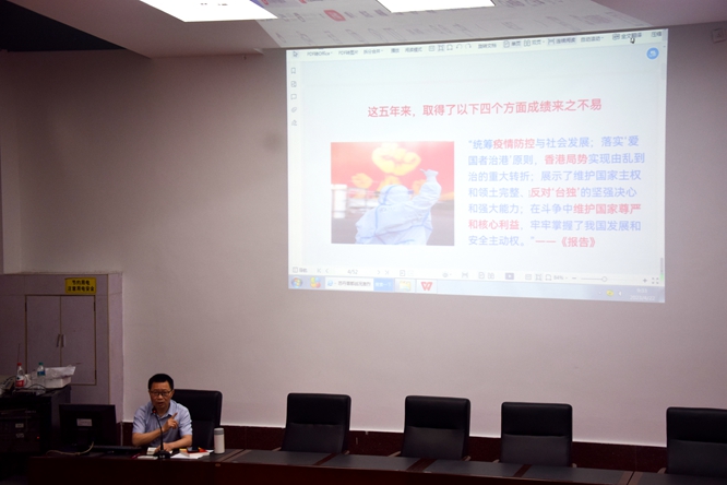 刘庆言以党的二十大报告要点为主线,用生动的语言、鲜活的案例,深入浅出地讲述了“牢牢把握过去5年工作和新时代10年伟大变革的重要意义、牢牢把握习近平新时代中国特色社会主义思想的世界观和方法论、牢牢把握以中国式现代化全面推进中华民族伟大复兴的使命任务、牢牢把握以伟大自我革命引领伟大社会革命的重要要求、牢牢把握团结奋斗的时代要求”等五个方面的内容。刘庆言号召所有党员同志务必不忘初心、牢记使命,政治上讲忠诚、组织上讲服从、行动上讲纪律,以实际行动践行党的二十大精神,为实现中华民族伟大复兴、为推动学校及学院的高质量发展不懈奋斗。