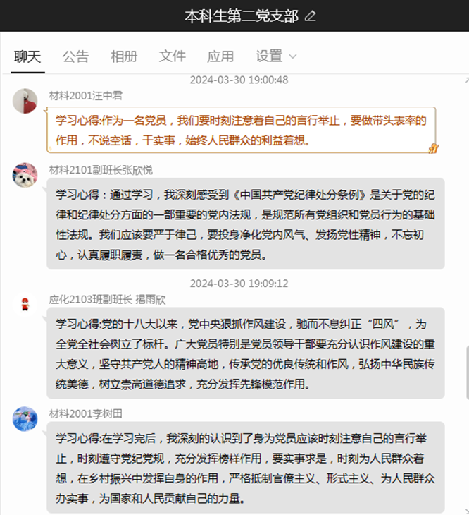 2024年3月30日至31日,本科生第二党支部通过线上方式开展3月份主题党日,组织支部党员认真学习《中国共产党纪律处分条例》新修订细则。