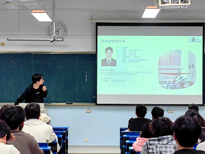 2024年3月24日19时,根据学院统一安排,本科生第二党支部党员李树田、胡楚楚走进新生班晚自习,分享自身学习成长经验。