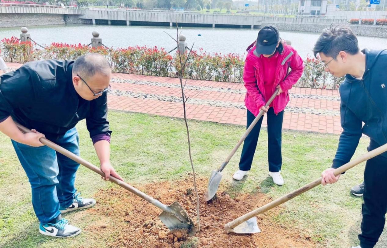 参加活动的老师同学们热情高涨、干劲十足,大家在校建处绿化队老师的指导下,以三五人为一组,挥锹铲土、扶正树苗、填土踩实、提水浇灌,合力种栽下一颗颗树苗。经过近两个小时的劳动,在大家的努力和配合下,11颗红花玉兰栽种完毕。