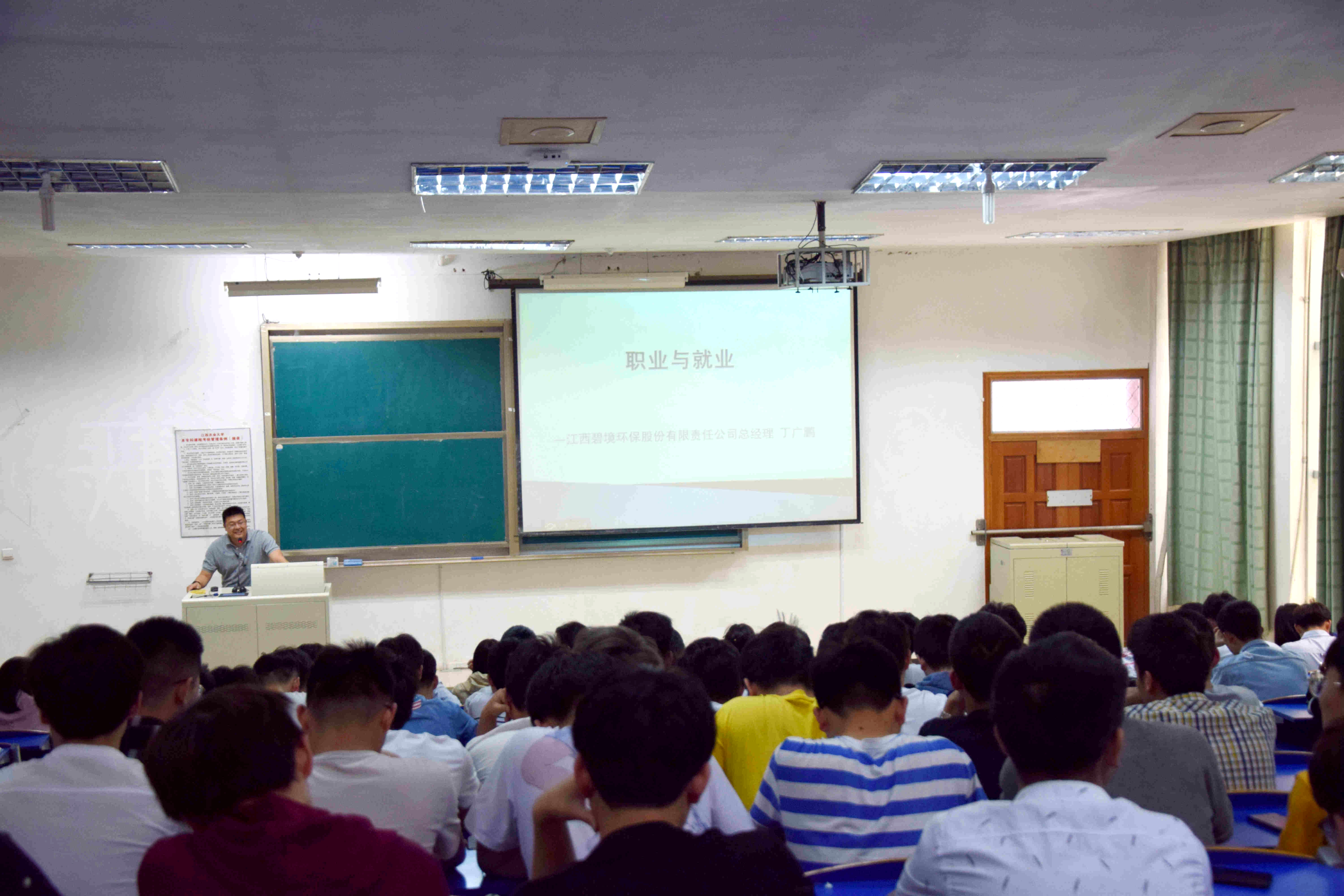 为强化员工对于职业、就业及创业的了解,进一步在学院浓厚就业氛围,5月11日下午,公司优秀毕业生,应化022班员工,现江西碧境环保科技股份有限责任公司总经理丁广鹏于二教106为公司2016级全体员工做了一场主题为“职业与就业”的专题讲座,讲座由学工办指导老师廖超主持。