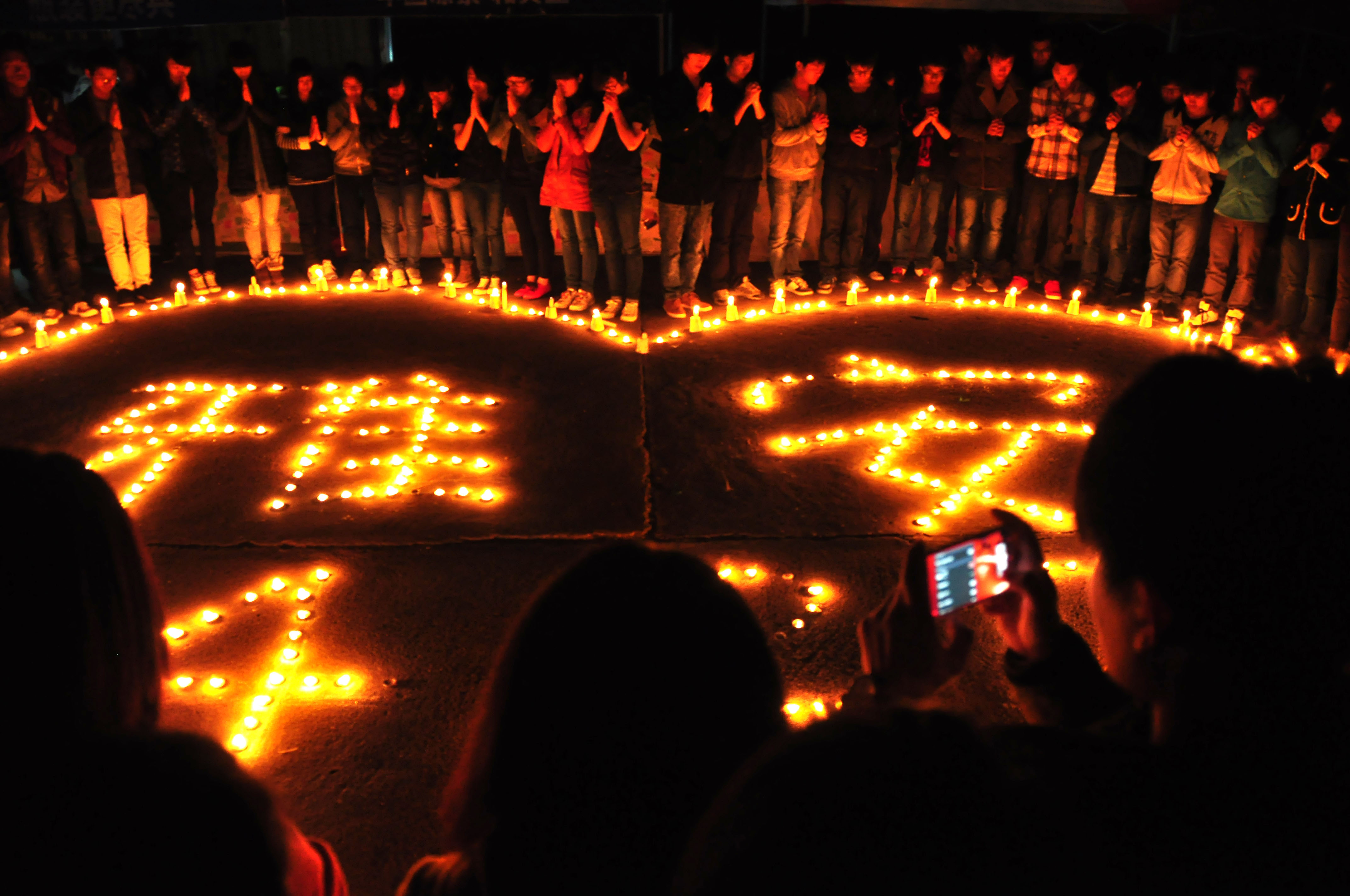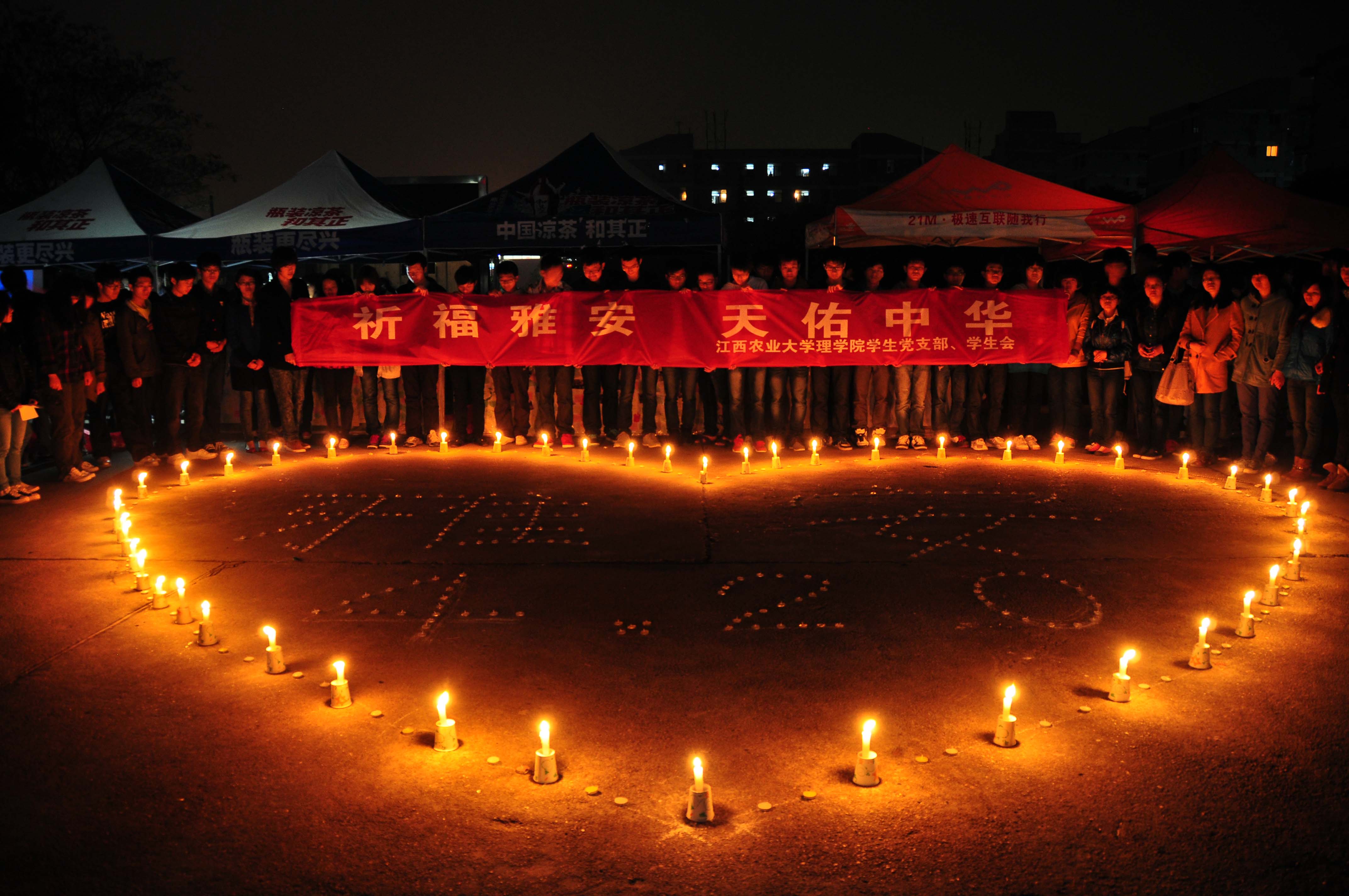 24日上午9点,在南区门口设立祈福宣传点,通过展板、广播宣传鼓动广大同学为雅安祈福,征集为雅安人民祈福的祝福语,宣传点还设立了爱心捐款箱。晚上九点,祈福活动正式开始,大家点亮“雅安 4.20”心形图案,100多名志愿者围绕心图,双手合十为雅安人民默哀一分钟,接着大家捧蜡烛围绕雅安心形图案同唱《感恩的心》。来往的同学纷纷掏出手机或相机拍下这动人的一幕。