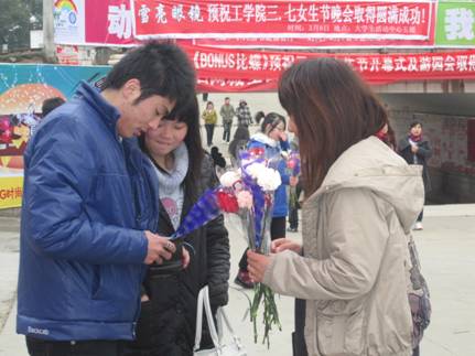 3月7日上午8:30,在悠扬的歌声下,义卖鲜花活动点燃理学院“三七”女生节游园活动的序幕。