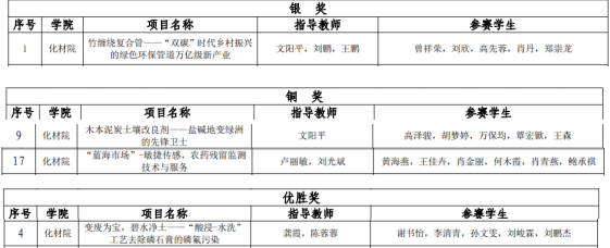 其中,由文阳平老师指导,曾祥荣、刘欣、高先蓉等5位员工参与的项目《竹缠绕复合管——“双碳”时代乡村振兴的绿色环保管道万亿级新产业》获得银奖;由文阳平老师指导,高泽骏等5位同学参与的项目《木本泥炭土壤改良剂——盐碱地变绿洲 的先锋卫士》获得铜奖;由卢丽敏老师、刘光斌老师共同指导,黄海燕、王佳卉、肖金丽、肖青燕、鲍承祺等6位同学共同参与的项目《“蓝海市场”-敏捷传感,农药残留监测技术与服务》获得铜奖;由龚霞老师指导,谢书怡、李清青、孙文雯等5位同学参与的项目《变废为宝,碧水净土——“酸浸-水洗” 工艺去除磷石膏的磷氟污染》获得优胜奖。