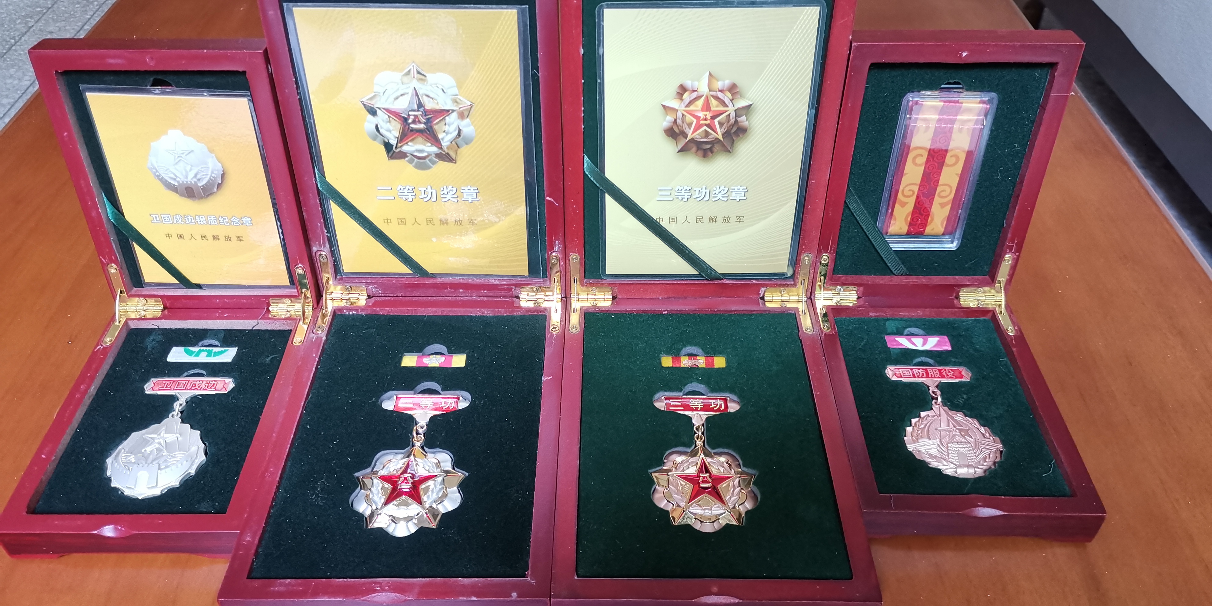 谢尚沛荣获的军功章(从左至右分别是卫国戍边银质纪念章、二等功奖章、三等功奖章及国防服役铜制纪念章)