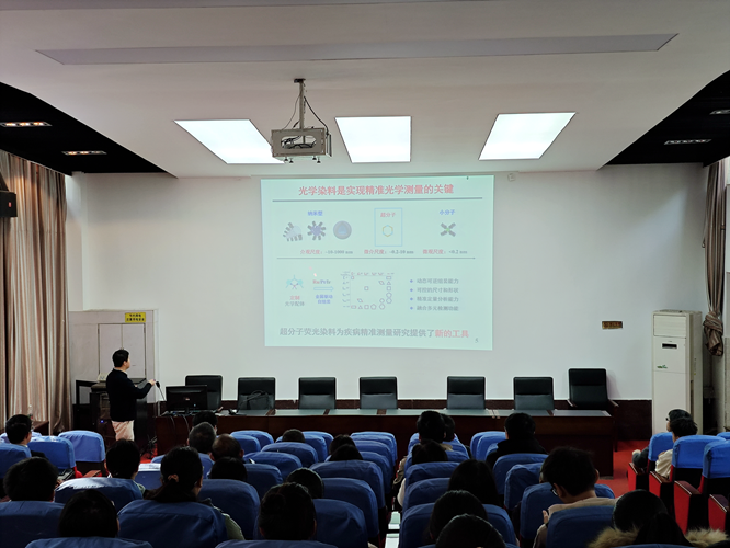 孙教授以重大疾病精准诊治需求为出发点,介绍了荧光成像在生物医学中的应用及荧光分析面临的挑战;提出了基于刚柔并济的策略,设计抗猝灭的超分子荧光探针,实现了病原菌感染的高信噪比检测;基于供/受体改造策略,构建了NIR-II区超分子荧光探针,实现了精细结构的高信噪比成像分析。孙教授生动形象的讲解深深吸引了在座的师生。在问答环节,孙教授认真回答了老师和同学们提出的许多问题。此次报告会拓宽了师生的学术视野。