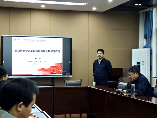 2023年11月24日下午3:00,湖南大学化学化工学院、化员工物传感与计量学国家重点实验室袁林教授受邀为化材学院师生作了一场主题为《氧杂蒽类荧光染料结构调控及其传感与成像应用》的精彩报告。报告由副经理卢丽敏教授主持,化材学院部分老师、全体硕士研究生参加此次报告。
