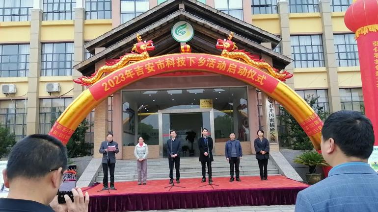 2023 年3月30日,吉安市科技局在新干召开2023 年度吉安市科技下乡活动启动会,新干县人民政府副县长杨成奎同志致辞,省农业科学院蔬菜花卉研究所周劲松、江西腊月红生态果业有限公司负责人聂雄辉分别做了典型发言,市科技局副局长周俊才同志宣布活动启动,参加此次活动的科技人员和农户有200余人,启动会后公司黄喜根教授、彭大勇和黄建平博士分别到基地调研和指导。
