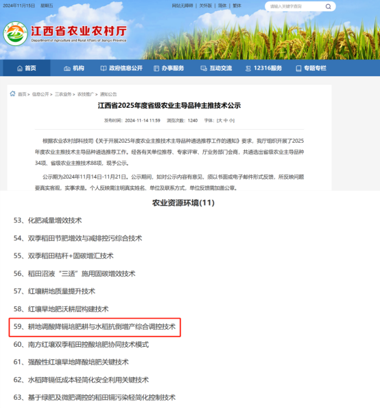 2024年11月,《江西省2025年度省级农业主导品种主推技术公示》发布,学院文阳平老师牵头的“耕地调酸降镉培肥与水稻抗倒增产综合调控技术”入选2025年农业资源环境主推技术。