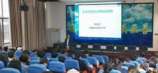 报告会上,郭庆祥教授从“生物质转化的意义及其策略”、“从纤维素出发合成γ-戊内酯”、“通过γ-戊内酯合成尼龙单体”、“纤维素催化转化制备乙醇”、“纤维素催化转化制备丙酮醇”、“从生物质制备含氮化合物”等六大板块进行了其研究内容及成果的介绍,突出讲解了生物质化学转化的几大例子及其应用。郭老先生儒雅的学术气质、严谨的科研态度以及其逻辑清晰的讲解深深的吸引着在座的师生。