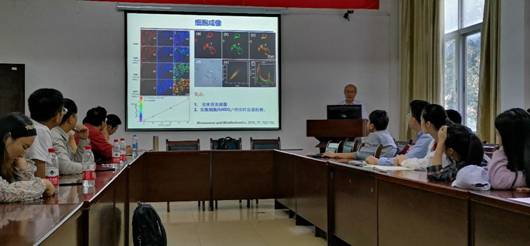 报告会上,曾林涛教授首先介绍了其研究背景,然后思路清晰、思维严谨地从生物传感与成像方向、食品安全方向及光气荧光探针研究进展等三大板块进行了其研究内容及成果介绍,突出讲解了在这三大板块中新型荧光探针的构建及其应用。在场的老师和同学们聚精会神的听着,认真地记录着知识点和疑难点。