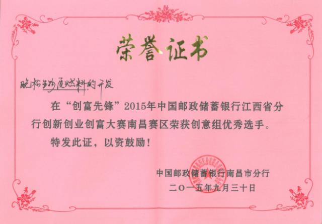 南昌市赛区共分为“创意组”、“ 初创组“、“成长组”三个小组。其中公司刘光斌老师指导,邵添等同学参与的“可再生绿色能源——晚松生物质燃料的开发”分在创意组。经过项目陈述、评委点评、答辩的形式,综合评分之后,公司“晚松生物质燃料的开发”荣获“创富先锋”2015年中国邮政储蓄银行江西省分行创新创业创富大赛南昌赛区创意组“优秀选手”。( 理学院分团委)