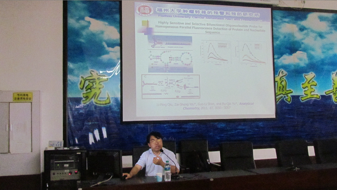 吴教授的报告从核酸适体探针、基因诊断、核酸纳米器件与疾病诊断三个方面,为我们展示了核酸探针及其肿瘤诊疗上的应用研究。利用普通序列与富G-序列核酸适配子发展了一系列的生物检测体系,研究了富G-DNA衍生纳米颗粒的团聚行为;此外,利用核苷酸杂交作用构建了DNA序列检测与点突变识别的新型电化学或者光员工物传感器。利用酶连接及酶切循环放大技术提高了功能核酸探针的灵敏度。这些研究工作设计巧妙,构思新颖,为生物分子高效、快速、方便检测提供了新方法。