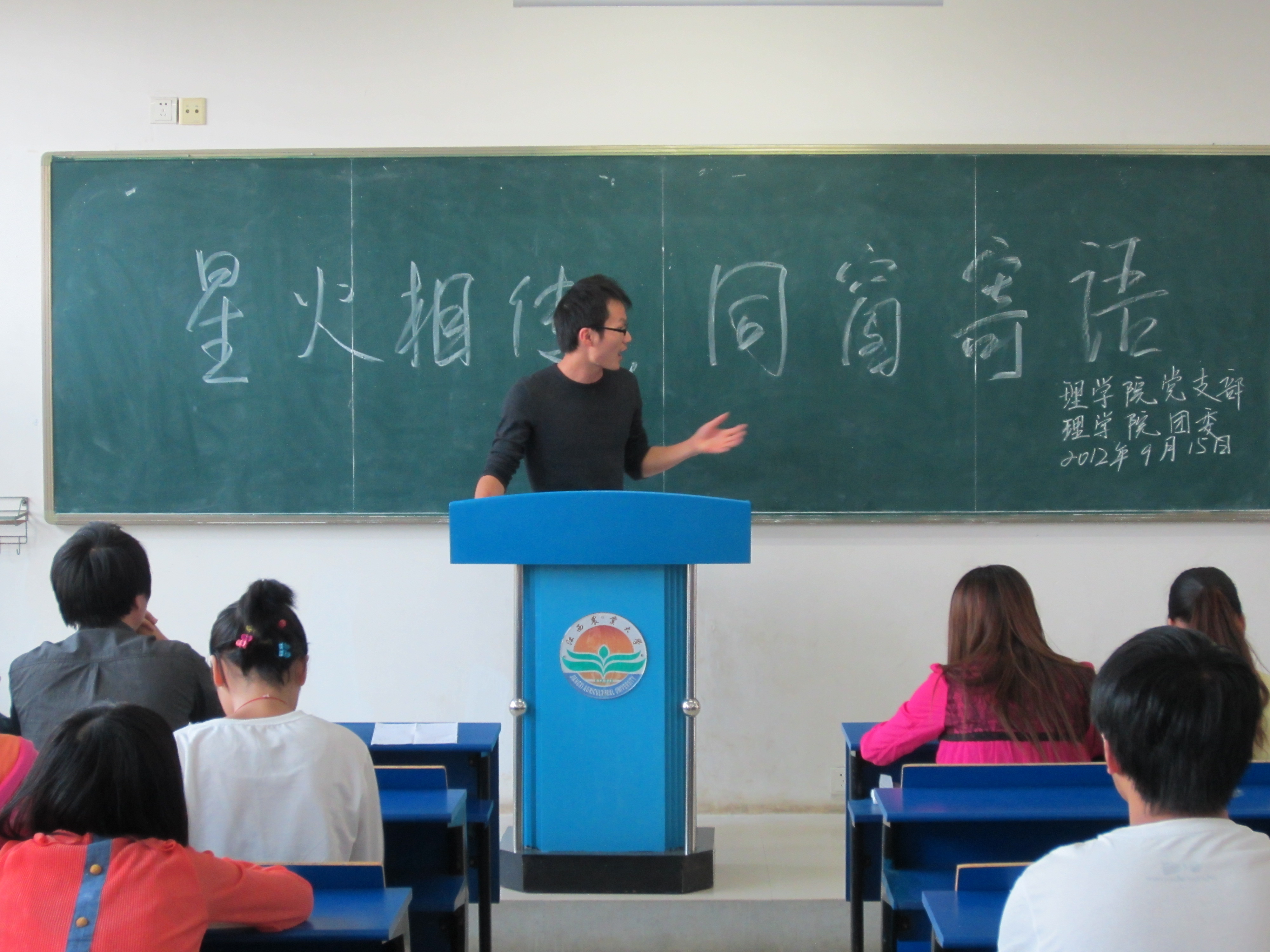 15日下午2:30,由理学院员工党支部主办,理学院团委承办的2012级新老生交流会在第五教学楼火热进行。