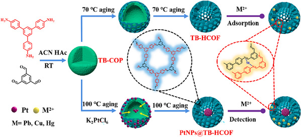 在本研究中,通过简单的非晶-结晶转化策略,包括1,3,5-三(4-氨基苯基)苯(TAPB)和1,3,5-苯甲醛(BTCA)之间的反应,开发了一种中空结构共价有机框架(TB-HCOF)。TB-HCOF结合了COFs的优点和空心结构的独特特性,如扩大的表面积、缩短扩散距离和易于获得的功能位点,展现出优异的吸附性能。此外,还设计了蛋黄壳铂纳米颗粒@TB-HCOF(PtNPS@TB-HCOF)作为重金属离子检测的电化学传感平台。由于具有特殊吸附能力的TB-HCOF与电导率显著的PtNPS之间的协同效应,传感器对Pb2+、Cu2+和Hg2+表现出良好的检测性能。