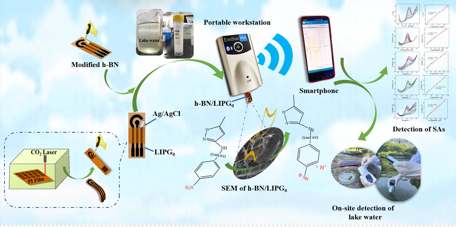 该研究采用激光直写技术在PI薄膜上制备LIPG柔性集成三电极,以二维六方氮化硼(2D h-BN)为工作电极修饰材料、Ag/AgCl油墨为参比电极修饰材料、LIPG为对电极,结合便携式工作站构建基于智能手机的廉价便携无线电化学传感平台实现对SAs快速检测。LIPG柔性集成三电极制备简单、成本低,且具有优异电化学性能。开发的廉价便携无线电化学传感平台成功实现对磺胺甲恶唑(SMZ)户外快检,在0.5 ~ 362.5 μM范围内具有良好的线性关系,检测限为0.011 μM。该平台还进一步成功应用于磺酰胺(SN)、磺胺异恶唑(SIZ)、磺胺二甲嘧啶(SM2)和磺胺吡啶(SPY)4种SAs的快速检测。该工作对开发廉价便携无线电化学传感平台应用于食品与环境户外快检具有重要理论价值与现实意义。