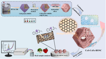 金属有机框架(MOFs)衍生的多孔碳在电化学传感领域引起了极大的兴趣[1-2]。然而,活性位点的有限可及性限制了它们的广泛应用;此外,MOFs本身继承的活性位点也非常有限。本研究提出了定向策略构建一种具有大孔壁的多元素掺杂空心碳笼材料(简称CoS-FeCo-HSNC),赋予其充足的可及性和丰富的共催化活性位点。该工作中,以包覆CdS纳米颗粒的ZnCo-MOFs作为前驱体,利用Zn和Cd元素低沸点的特性,使得材料具有独特的中空介孔结构。此外,在热解过程中同步引入外源铁离子(Fe3+),以促进碳骨架外壁由封闭转变为开口。同时,煅烧过程中也形成了高催化活性的CoS颗粒、Fe和N活性催化位点。本研究选用广谱杀虫剂苯菌灵作为传感检测模型。吸附实验表明,具有外部开口结构能够有效提高对目标物的传质速率和吸附能力,同时增加了活性位点的利用率和电催化能力。基于CoS-FeCo-HSNC的传感器表现出优异的分析性能,最低检测限达到0.3 nM。该方法也展示了良好的选择性、稳定性和在实际蔬菜和水果样品中的优越回收率。